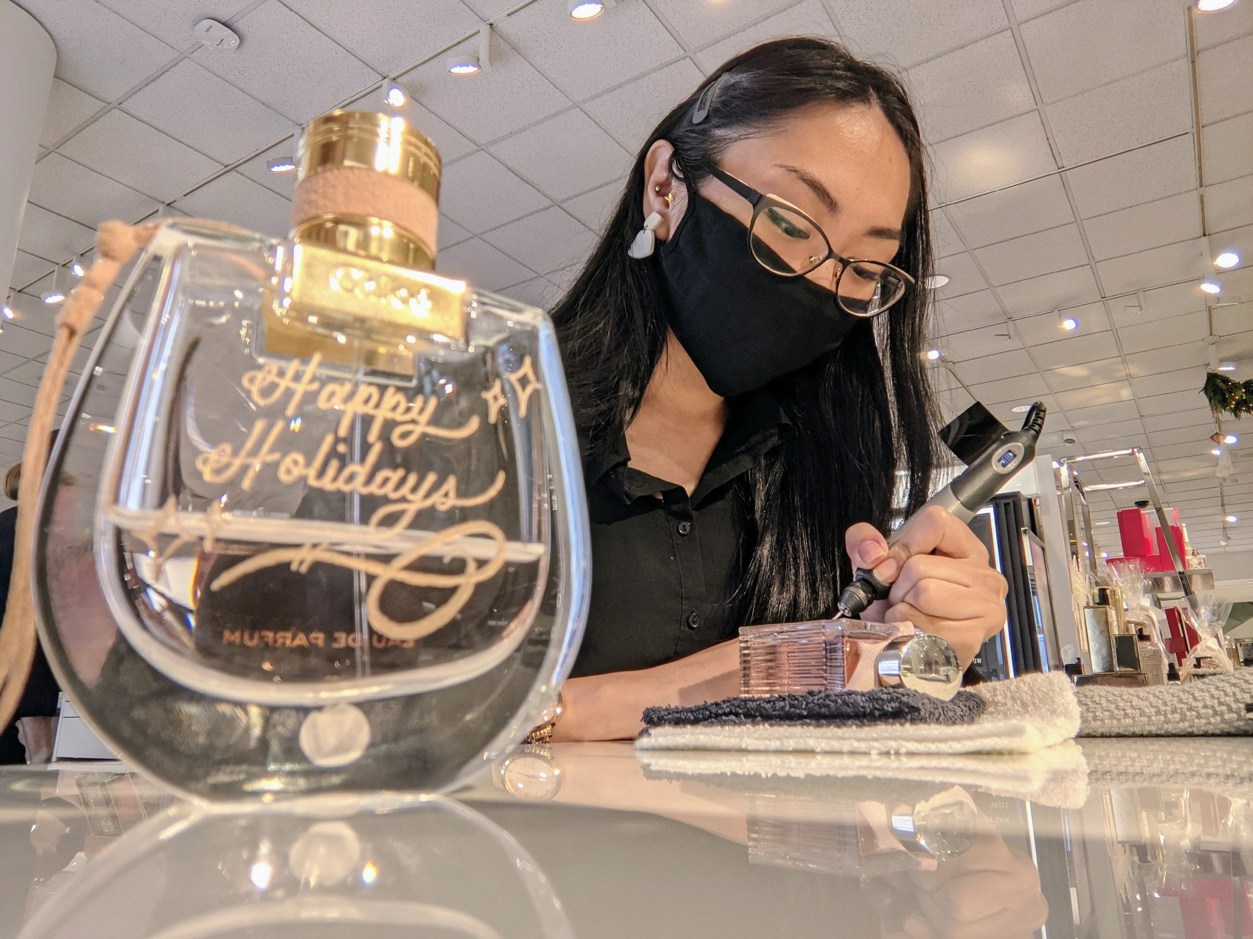 I originally started off by making hand-lettered wedding signs in 2018. In 2020, when in-person events took a pause, I expanded my skills and taught myself how to do glass engraving. Now I also do on-site engraving for brand activations and private events, as well as commissions for personalized items and customized gifts.